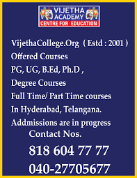 (A Division of Vasavi Eductional Trust) Since 2001, courses in all subjects and specialisations have been offered. BA, Bcom, BSC, BBA, BBM, BSC, BHMT, MA, MCOM, MSC, MCA, Executive MBA, MBA, and Ph.D. innovative, dedicated to excellence in teaching, research, and knowledge transfer, and to serve the nation’s social, cultural, and economic needs.To innovate and provide educational programmes in a variety of disciplines through synergistic interactions with industry and society.To provide students with knowledge and skills that will prepare them to face emerging challenges in the knowledge area.To give women students equal opportunities and to prepare them to be equal partners in meeting the nation’s scientific and technological demands.Instilling a global perspective and international skills in students.Part Time/ Full Time course : Bachelor of Education(B.Ed). Vijetha Academy best regular and Distance college in hyderabad. Top B.Ed and MSc college in hyderabad